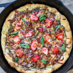 Strawberry Pesto Skillet Pizza. Homemade pizza crust cooked in a cast iron skillet. Topped with pesto, ...
