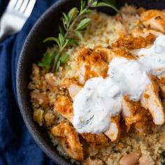 Harissa Chicken with Couscous and Mint Sauce. Chicken marinated in a homemade harissa sauce, served ...